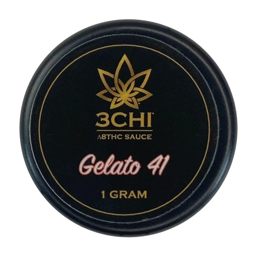 The 3Chi Delta 8 Dabs Sauce – Gelato 41 has an unbeatable uplifting feel and is made of 95% Delta 8 THC (D8, Δ8) oil and 5% Cannabis-Derived Terpenes (CDT). This delicious berry-citrus flavored sauce will have your head in the clouds.