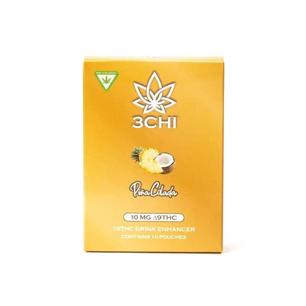 The 3Chi Delta 9 THC Drink Enhancer – Pina Colada is a delicious tropical treat packed with the profiles of pineapple and coconut. This dispensary-grade Delta 9 drink enhancer can be added to water or any other drink to transform your mocktail into a cannabis cocktail that will take you on a full mind, body, and spirit experience. This package of drink enhancers includes 10 pouches, each containing 10 mg Delta-9, for a total of 100 mg hemp-derived Delta 9 THC per package.  The patented potent powder inside these drink enhancers is extremely fast-acting and can have long-lasting effects.  This drink technology has won multiple cannabis awards and is available in 6 delicious flavors.