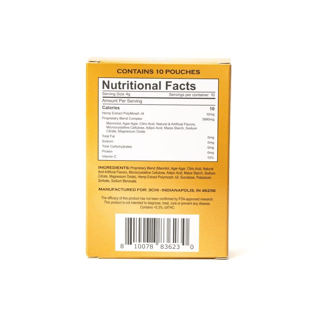 The 3Chi Delta 9 THC Drink Enhancer – Tangerine Lime introduces a familiar burst of citrus with a bright, summery, fresh squeezed taste. This dispensary-grade Delta 9 drink enhancer can be added to water or any other drink to transform your mocktail into a cannabis cocktail that will take you on a full mind, body, and spirit experience. This package of drink enhancer includes 10 pouches, each containing 10 mg Delta 9, for a total of 100 mg hemp-derived Delta 9 THC per package. The patented potent powder inside these drink enhancers is extremely fast-acting and can have long-lasting effects. This drink technology has won multiple cannabis awards and is available in 6 delicious flavors.