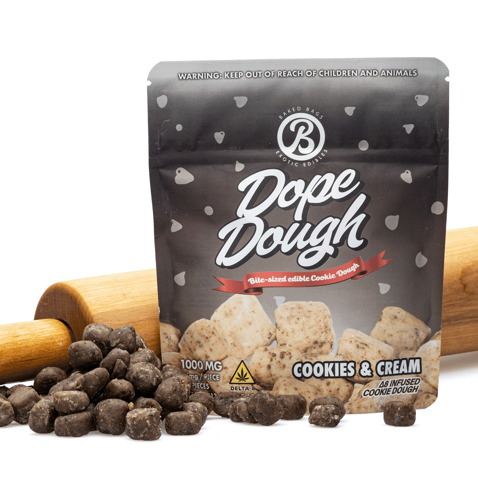 Baked Bags Delta 8 Dope Dough – Cookies and Cream cookie dough bites bring a delicious twist to a classic favorite. Each piece packs 25 milligrams of Delta 8 THC, totaling 1000 milligrams per bag, offering a flavorful and fun way to experience the benefits of Delta 8. The rich blend of creamy vanilla and crunchy cookie bits creates an indulgent treat with a modern edge.