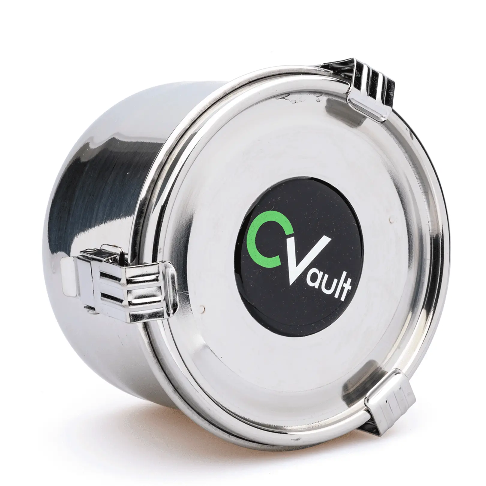 A CVault is a specially engineered container for storing flower in ideal conditions. Made from 304 food-grade stainless steel, it features an airtight seal and includes a Boveda humidity pack, which automatically balances the humidity inside the container. This keeps your flower from drying out or becoming too moist, helping preserve freshness and quality without any maintenance.