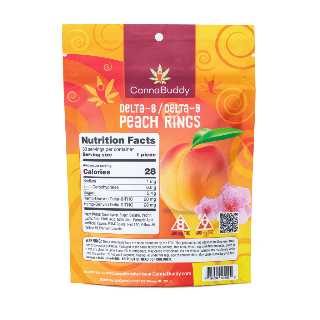 The CannaBuddy Delta 8 / Delta 9 Peach Rings contain 20 mg of Delta 8 THC AND 20 mg of Delta 9 THC per gummy and have a delicious peach flavor. Each package contains 30 gummies, for a total of 600 mg Delta 8 THC AND 600 mg Delta 9 THC per bag. These yummy gummies deliver a potent and energizing feel that will get you motivated and keep you going. These edibles are made with flavorless distillates derived from US grown hemp, so there’s no cannabis flavor!