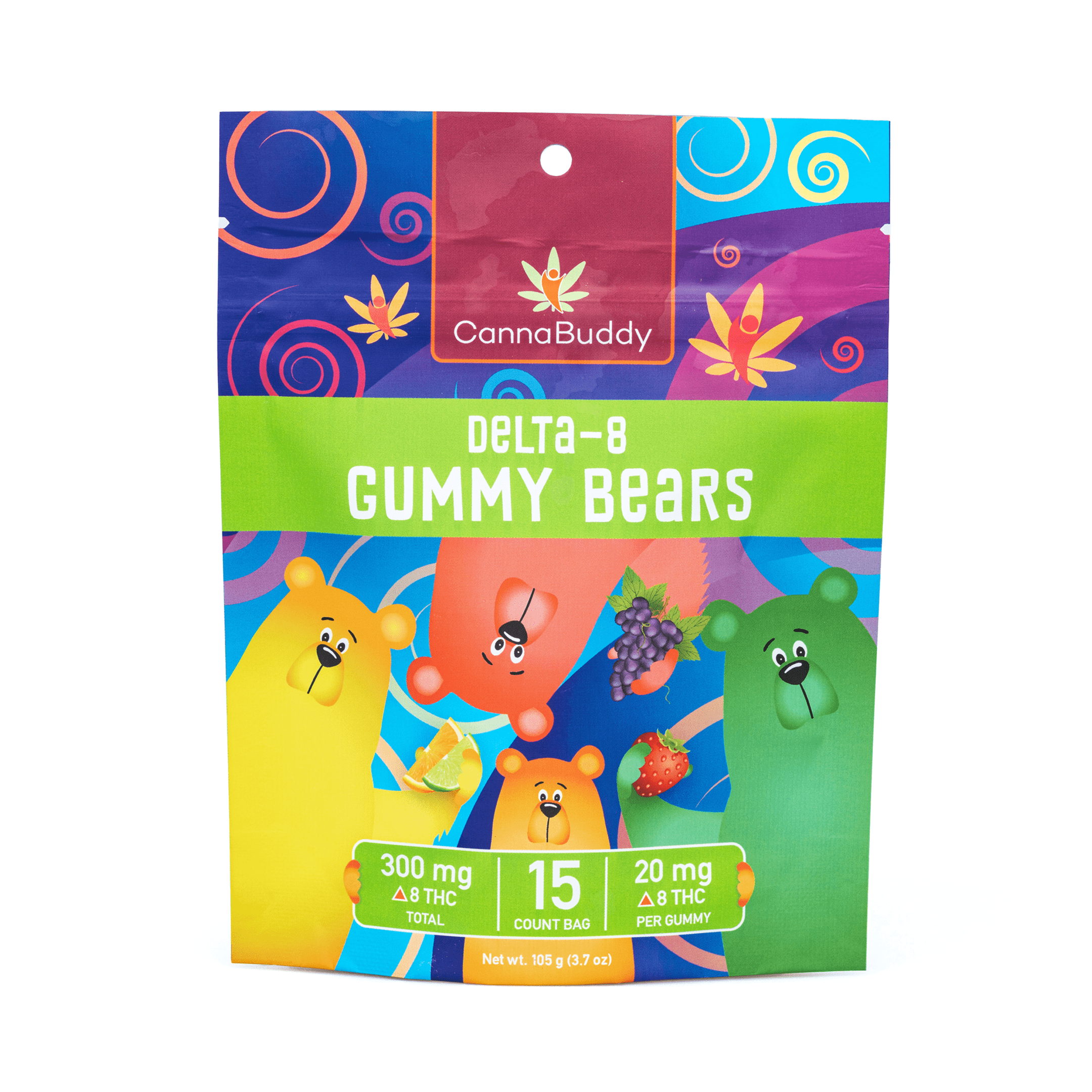 The CannaBuddy Delta 8 Gummy Bears are a delicious fruit-flavored way to enjoy the benefits of Delta 8 THC (D8). Delta 8 THC is another cannabinoid found in the cannabis plant, but unlike CBD, Delta 8 THC can have psychoactive effects, similar to Delta 9 THC (which is what is found in marijuana). These tasty gummies are derived from US grown hemp.