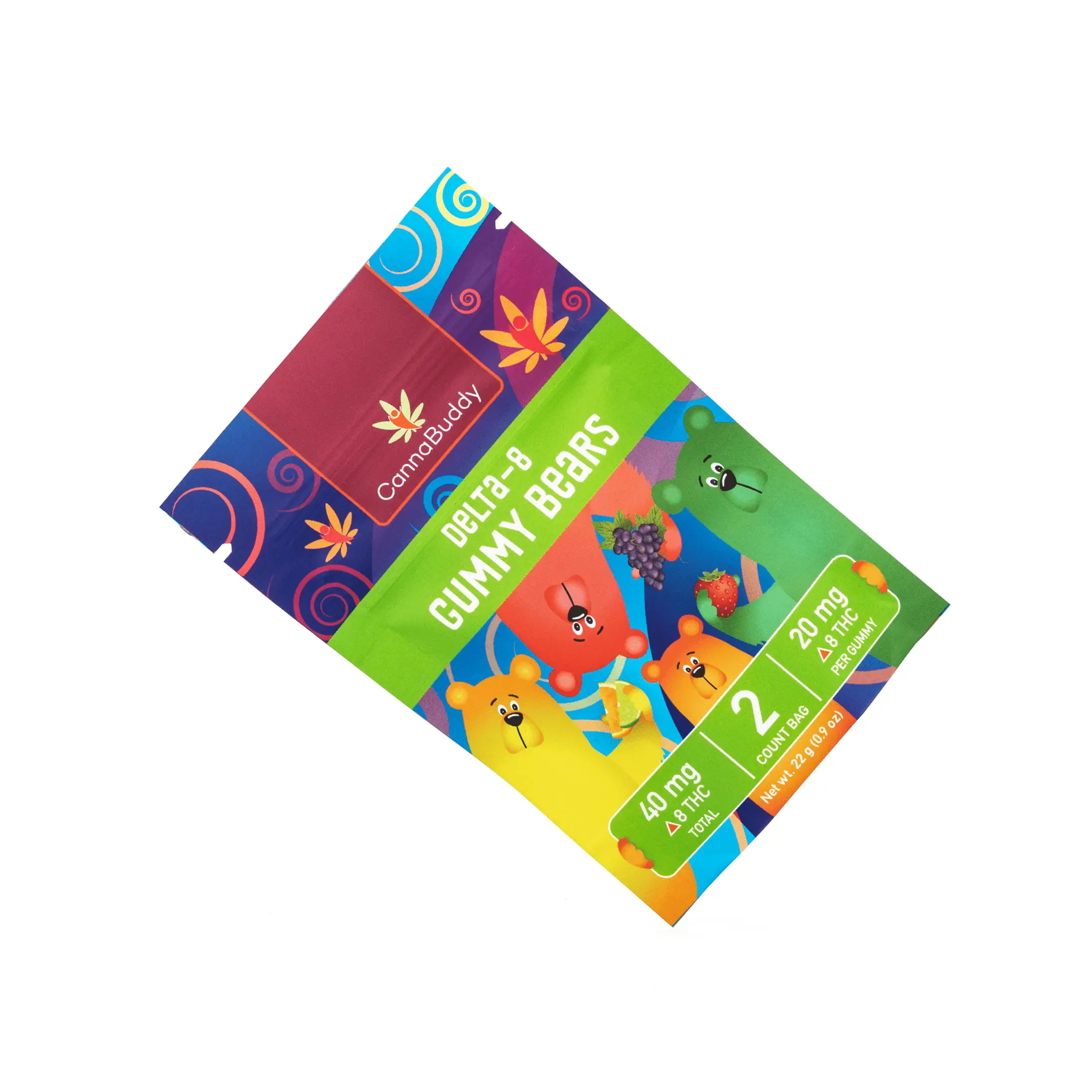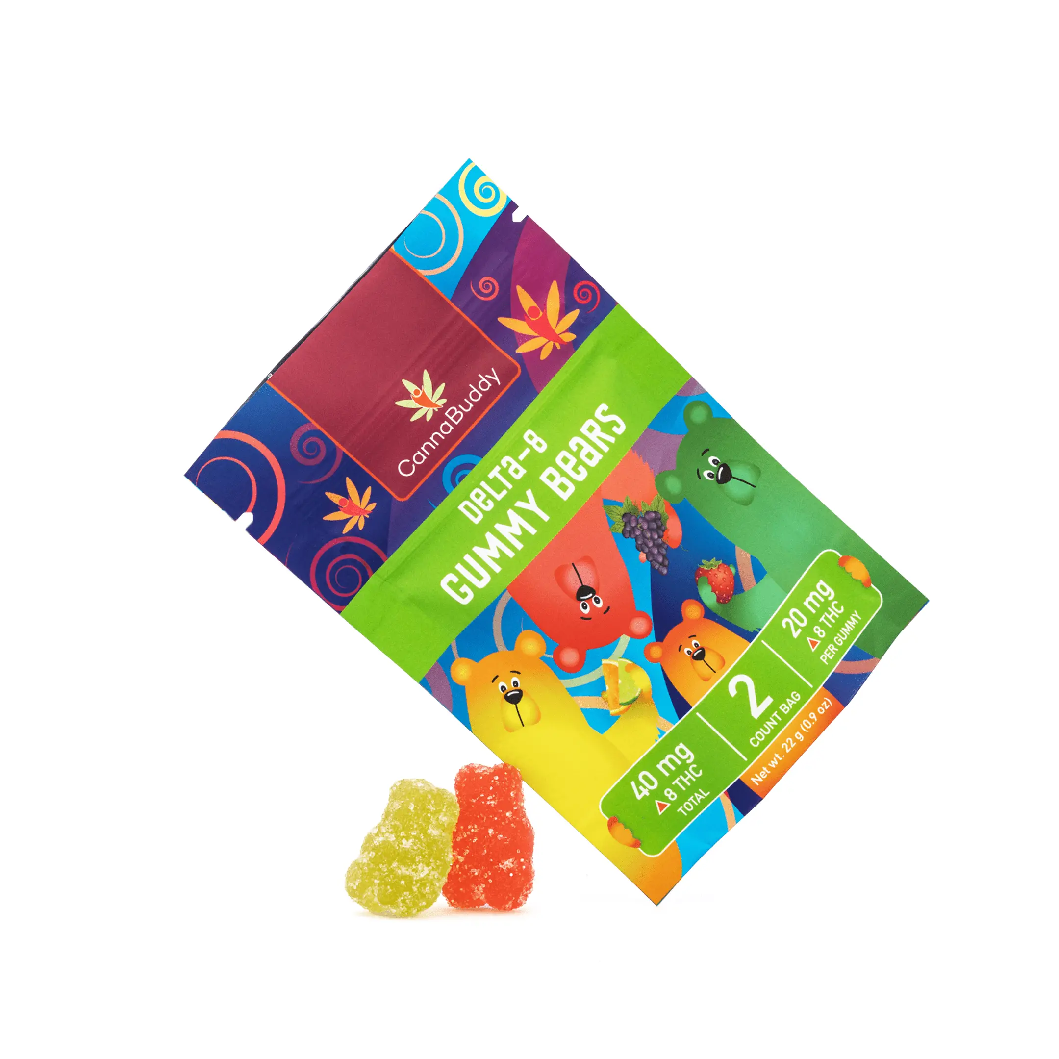 The CannaBuddy Delta 8 Gummy Bears contain 20 mg of Delta 8 THC per gummy and have the delicious fruity flavors of strawberry, grape, lemon and orange. Each package contains 2 gummies, for a total of 40 mg Delta 8 THC per bag. These yummy gummies deliver a relaxing and calming feel that will help you keep a positive attitude all day long. These edibles are made with flavorless distillates derived from US grown hemp, so there’s no cannabis flavor!