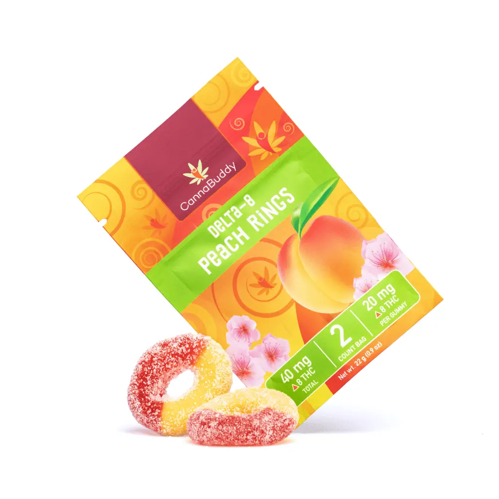 The CannaBuddy Delta 8 Peach Rings contain 20 mg of Delta 8 THC per gummy and have a delicious peach flavor. Each package contains 2 gummies, for a total of 40 mg Delta 8 THC per bag. These yummy gummies deliver a relaxing and calming feel that will help you keep a positive attitude all day long. These edibles are made with flavorless distillates derived from US grown hemp, so there’s no cannabis flavor!