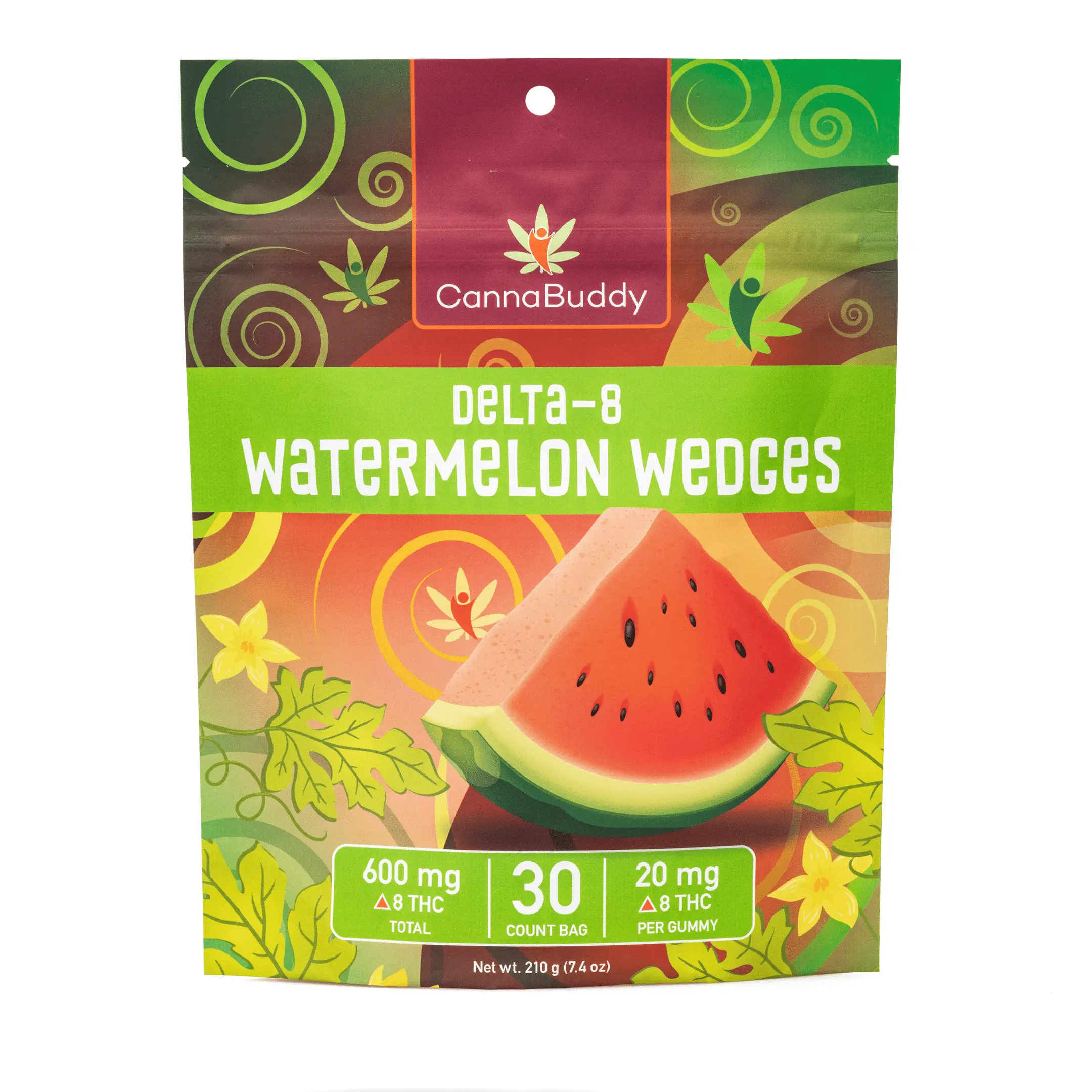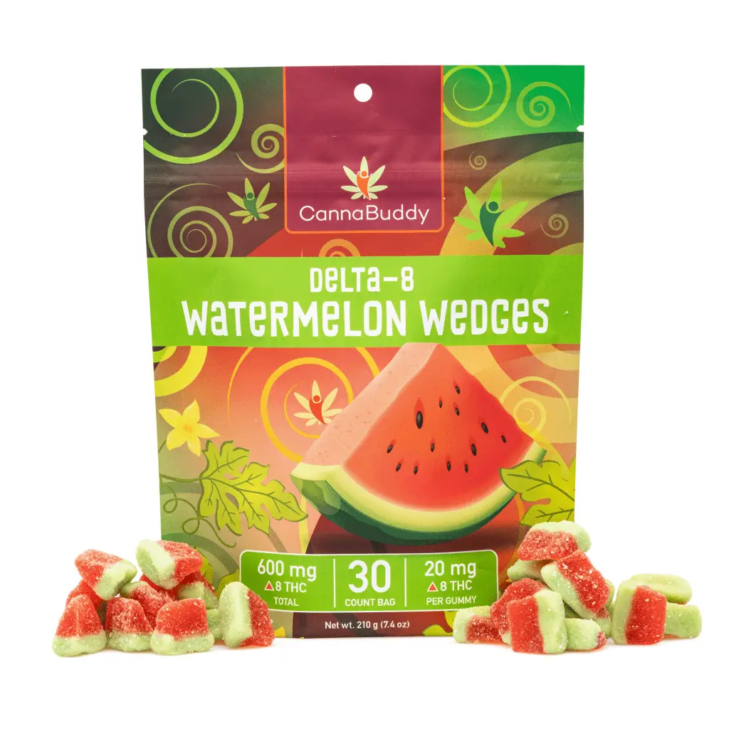 The CannaBuddy Delta 8 Watermelon Wedges are a delicious watermelon-flavored way to enjoy the benefits of Delta 8 THC (D8). Delta 8 THC is another cannabinoid found in the cannabis plant, but unlike CBD, Delta 8 THC can have psychoactive effects, similar to Delta 9 THC (which is what is found in marijuana). These tasty gummies are derived from US grown hemp.