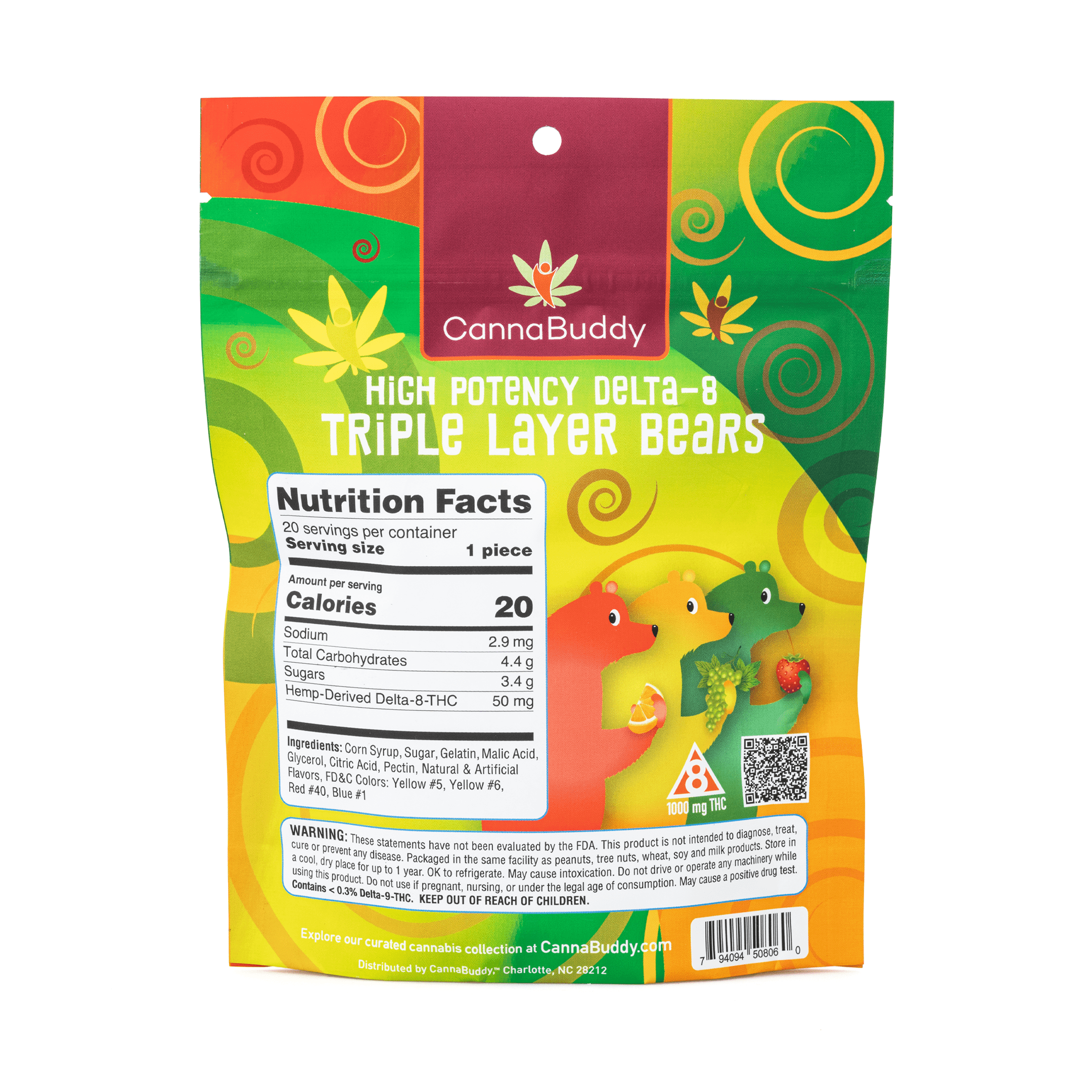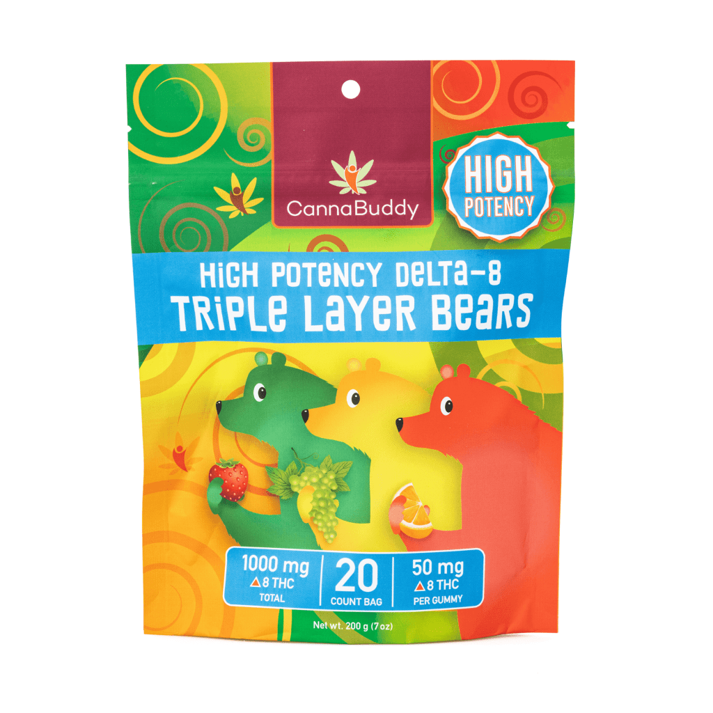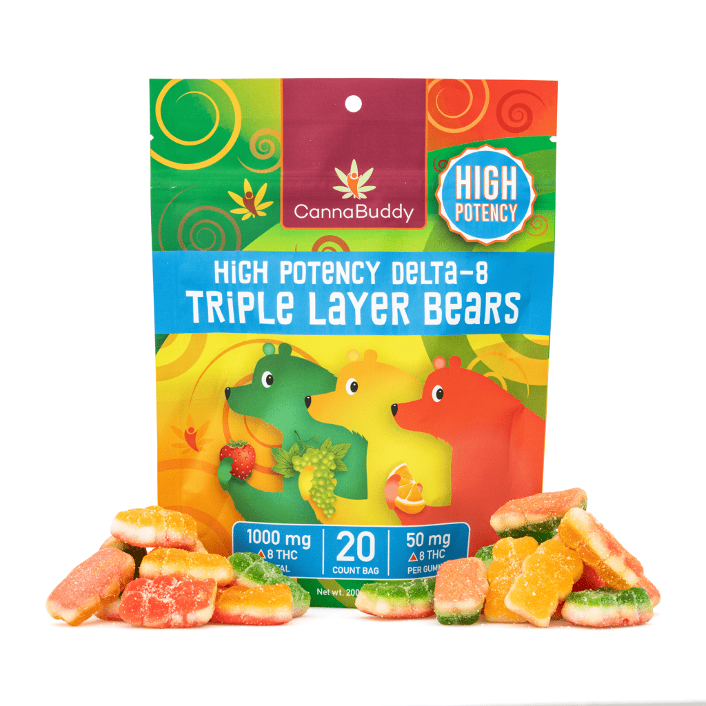 The CannaBuddy High Potency Delta 8 Triple Layer Bears are a delicious fruit-flavored way to enjoy the benefits of Delta 8 THC (D8), and now come in a stronger dose. Delta 8 THC is another cannabinoid found in the cannabis plant, but unlike CBD, Delta 8 THC can have psychoactive effects, similar to Delta 9 THC (which is what is found in marijuana). These tasty gummies are derived from US grown hemp.