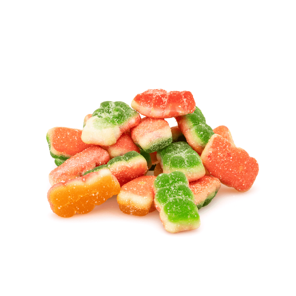 Corn syrup, sugar, gelling agent: gelatin, acids: malic acid, humectant: glycerol acids: citric acid, gelling agent: pectin, natural & artificial flavors. Colors: yellow 5, yellow 6, red 40, blue 1, and naturally occurring cannabinoid oil. Contains Hemp Derived Delta 8 THC.