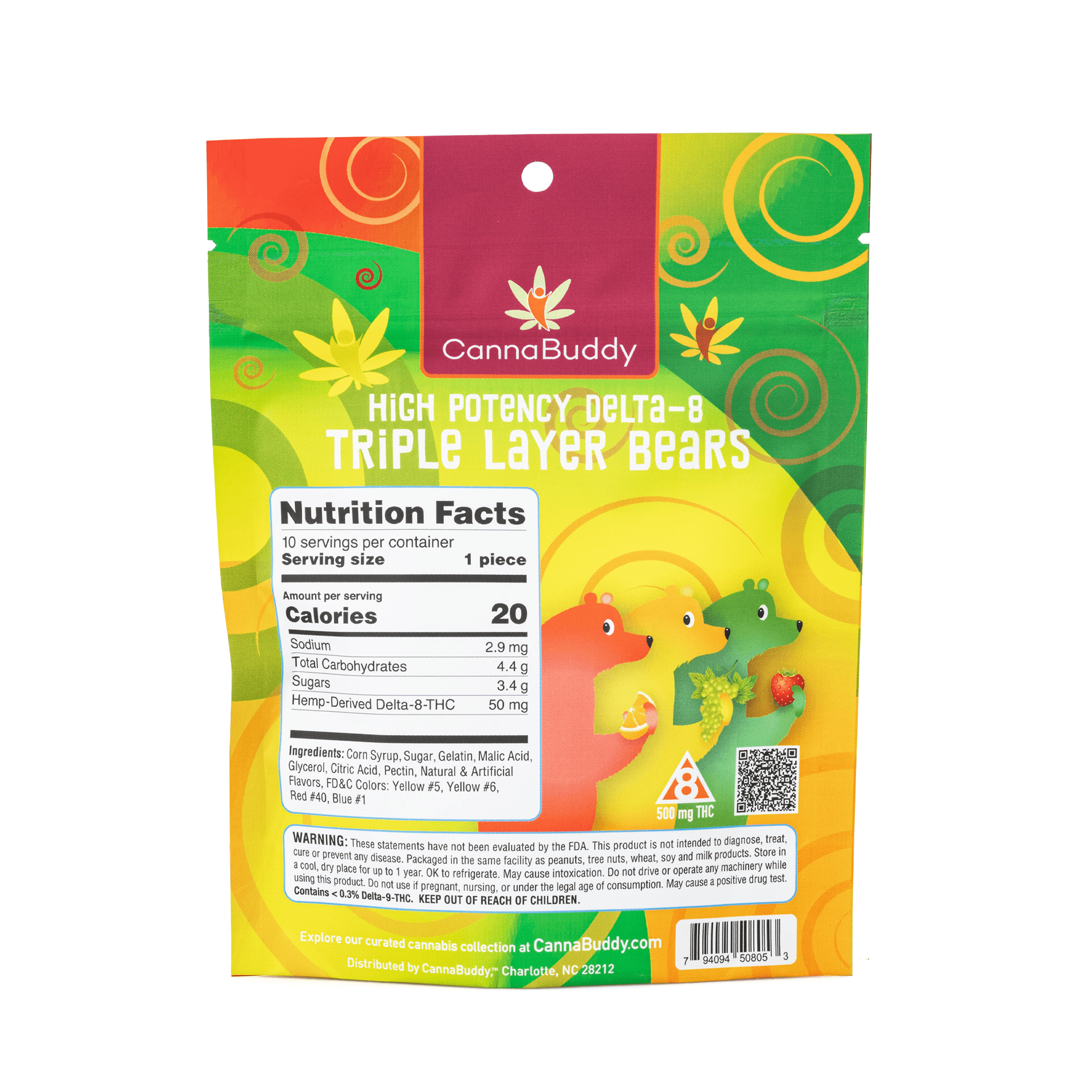 The CannaBuddy High Potency Delta 8 Triple Layer Bears are a delicious fruit-flavored way to enjoy the benefits of Delta 8 THC (D8), and now come in a stronger dose. Delta 8 THC is another cannabinoid found in the cannabis plant, but unlike CBD, Delta 8 THC can have psychoactive effects, similar to Delta 9 THC (which is what is found in marijuana). These tasty gummies are derived from US grown hemp.