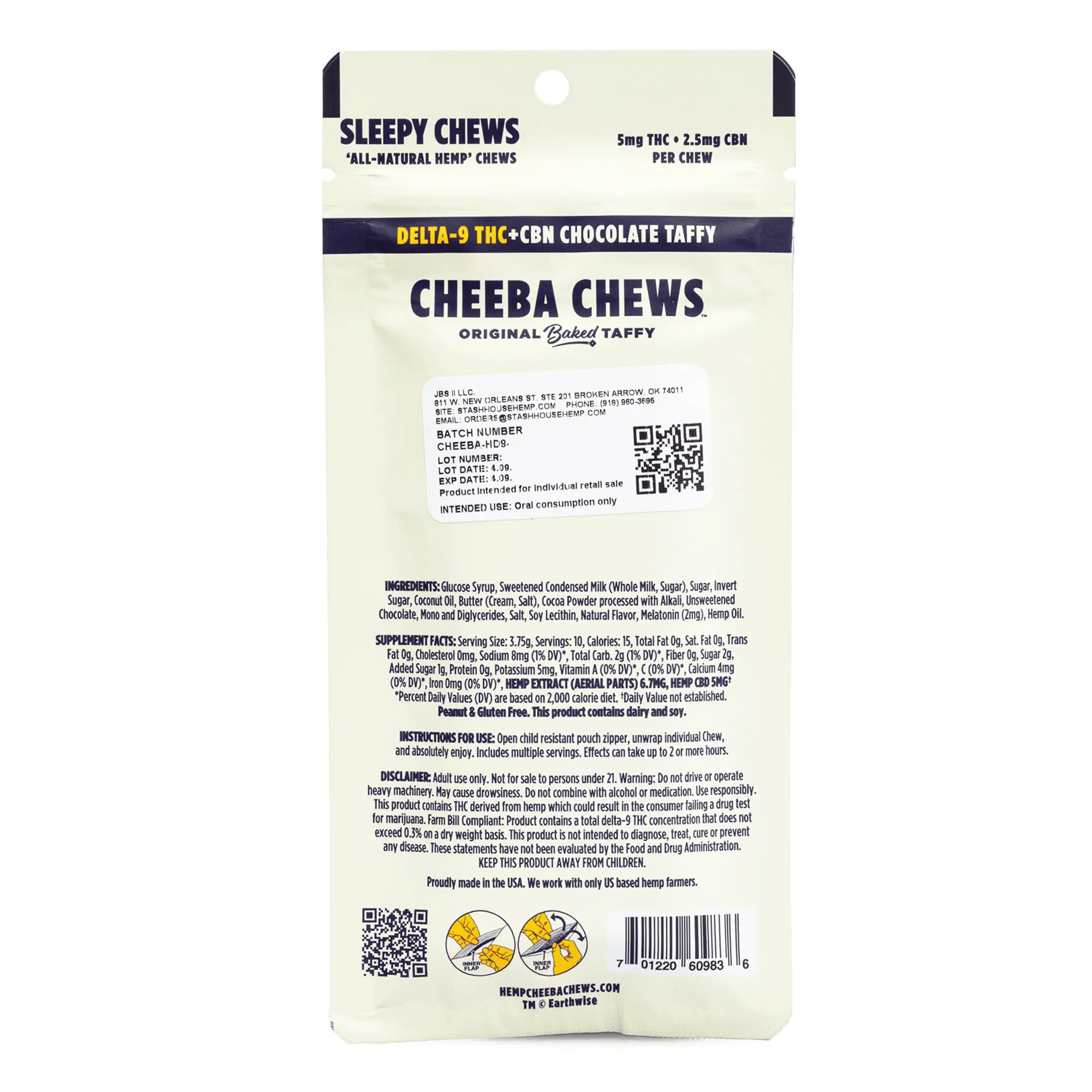 Cheeba Chews Delta 9 and CBN Chocolate Taffy – Sleepy Chew offers a decadent chocolate taffy experience designed to support restful sleep. Each chew contains 5 milligrams of Delta 9 tetrahydrocannabinol (THC), 2.5 milligrams of cannabinol (CBN), and approximately 2 milligrams of melatonin, delivering a balanced blend of relaxation. With 20 chews per pack, they provide a total of 50 milligrams of THC, 25 milligrams of CBN, and 40 milligrams of melatonin.