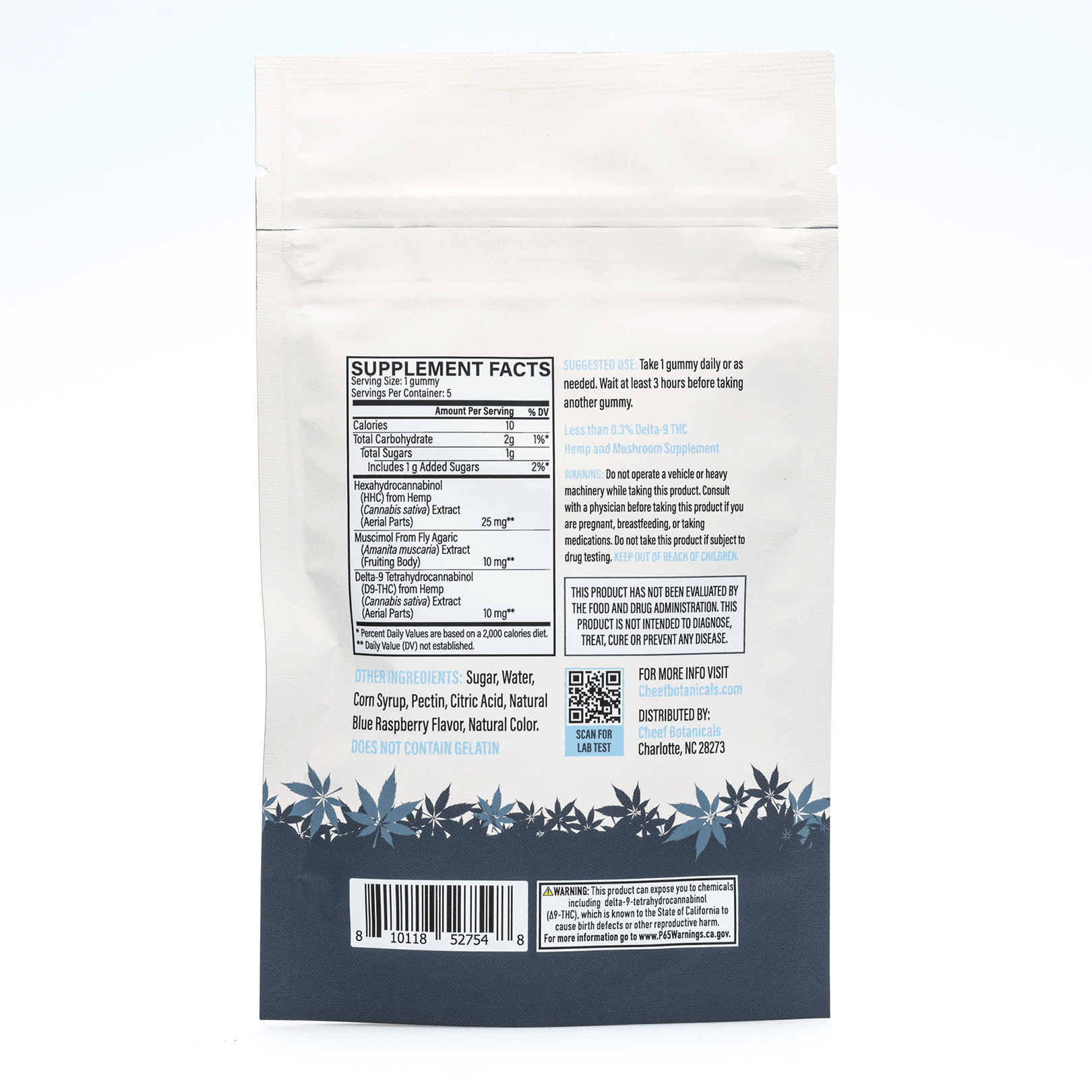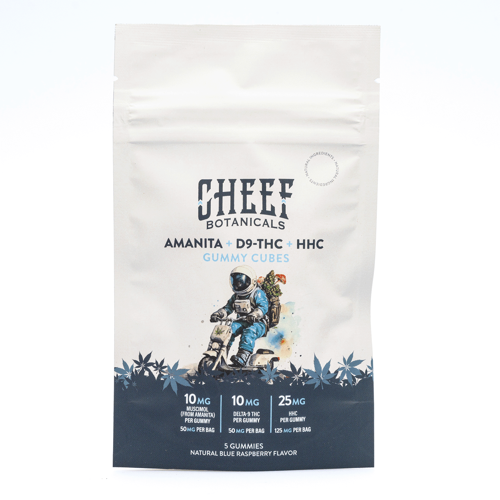 Each bag contains five blue raspberry flavored gummies each with 10 milligrams of muscimol from the Amanita Muscaria fruiting body, 10 milligrams of Delta 9 THC, and 25 milligrams of HHC. Customers that have never tried this combination should eat one-half of a gummy. Then, wait three hours to see if there are any effects. If there are no effects, eat the other half of the gummy. There are no artificial coloring or flavors and all products are third-party lab-tested to ensure quality, efficacy, and potency.