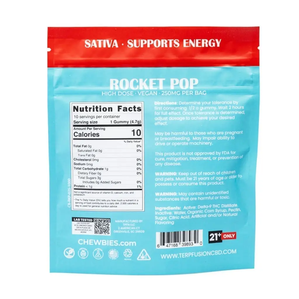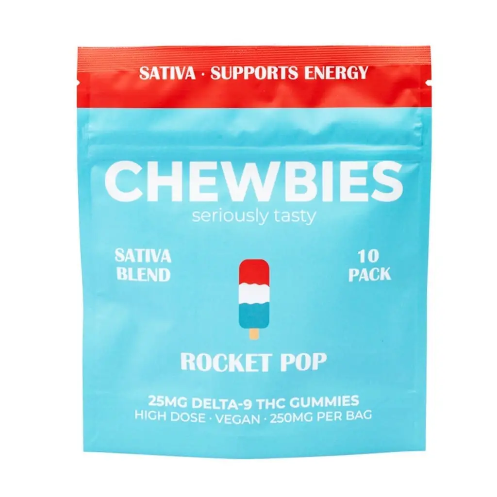 Chewbies Delta 9 THC Gummies – Rocket Pop Sativa reimagine a classic freezer pop flavor in a modern Delta 9 format. Each piece delivers 25 mg of hemp-derived Delta 9 THC, wrapped in a bright, layered taste that opens with cherry sweetness, transitions into citrusy lime, and finishes with a cool blue raspberry note.