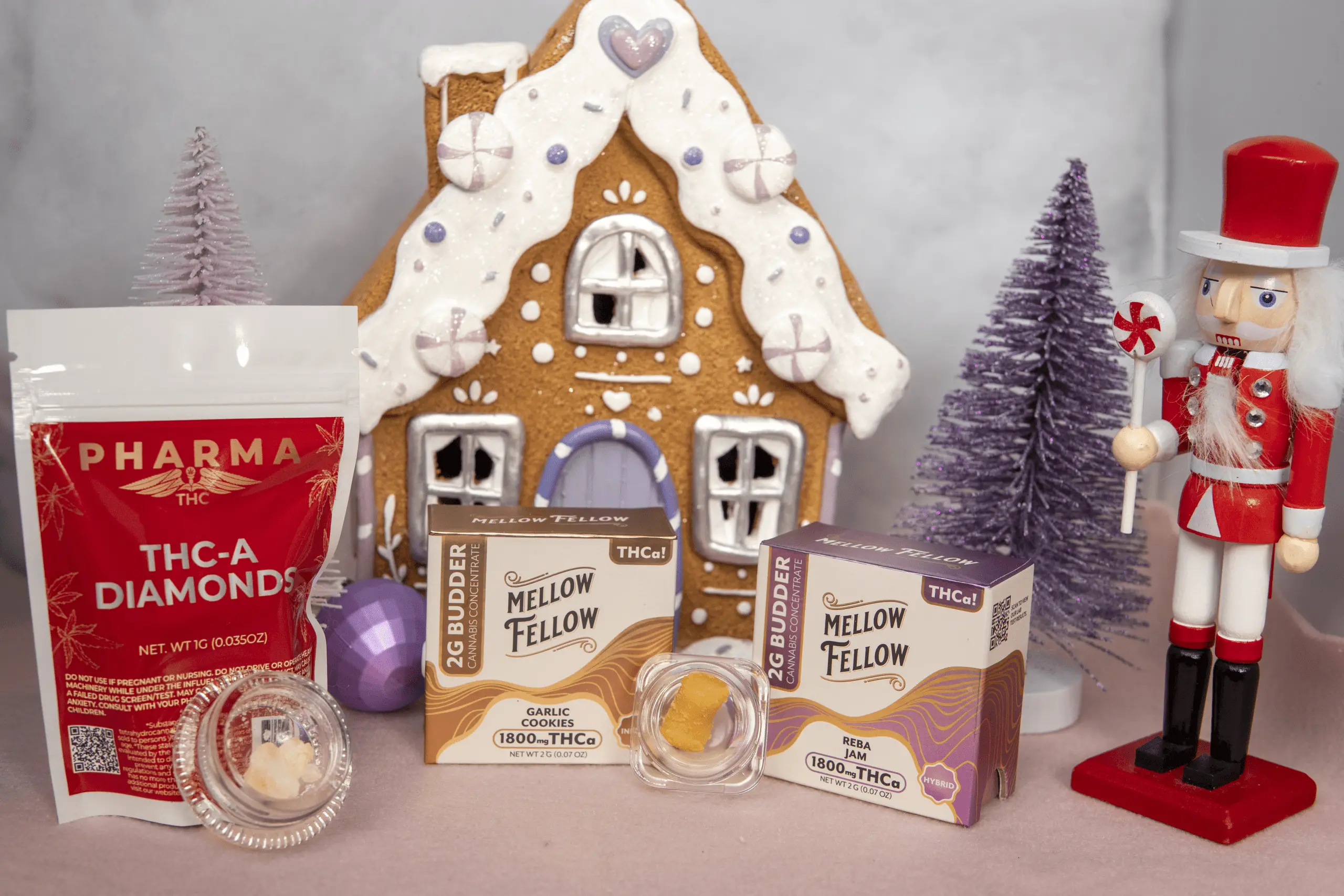 The Dabbler Sampler is built for dabbers who want options that actually feel different. You get 5 grams total: 1 gram of PharmaTHC THCa Diamonds plus two 2-gram Mellow Fellow THCa Budders in Garlic Cookies and Reba Jam. That means one ultra-clean, THCa-forward concentrate and two terp-rich jars you can rotate based on the mood.