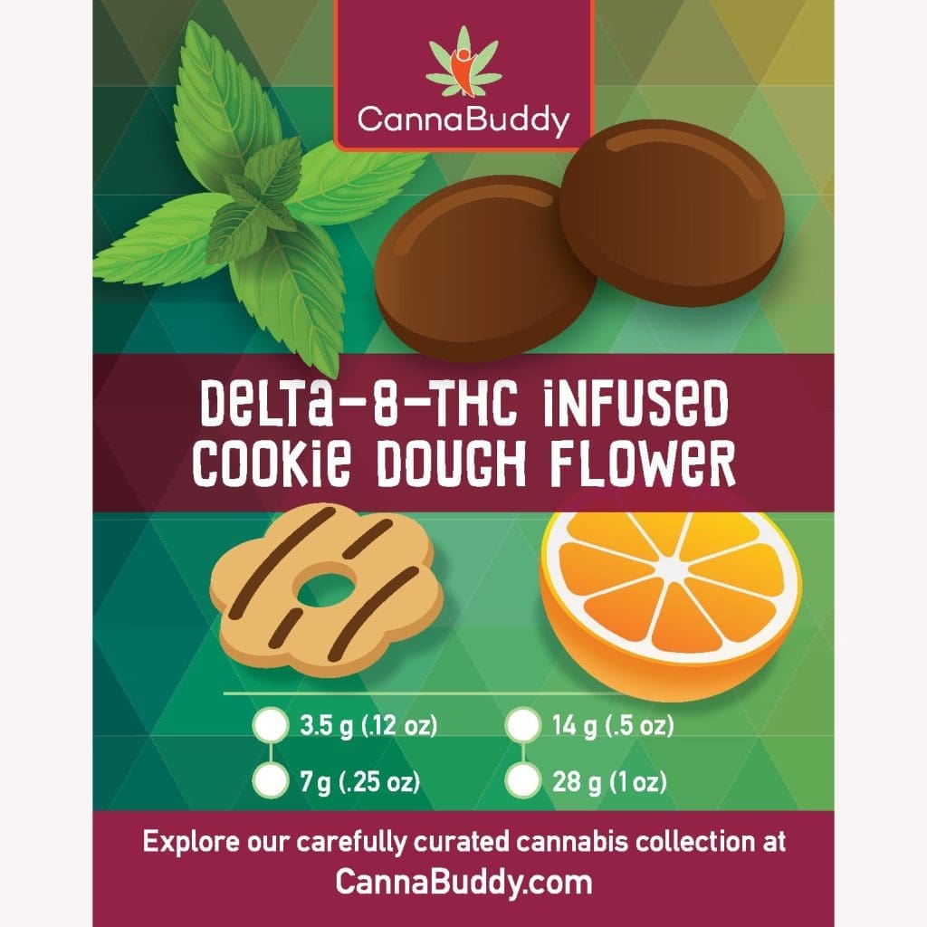 Our Delta 8 THC Infused Flower – Cookie Dough is a delicious way to smoke Delta 8 THC (D8). Delta 8 THC is another cannabinoid found in the cannabis plant, but unlike CBD, Delta 8 THC can have psychoactive effects, similar to Delta 9 THC (which is what is found in marijuana). Made from US grown hemp that has been infused with Delta 8 THC isolate and natural terpenes to deliver a smooth and satisfying smoke. Contains 9.2% CBD and and whopping 24.1% Delta 8 THC!