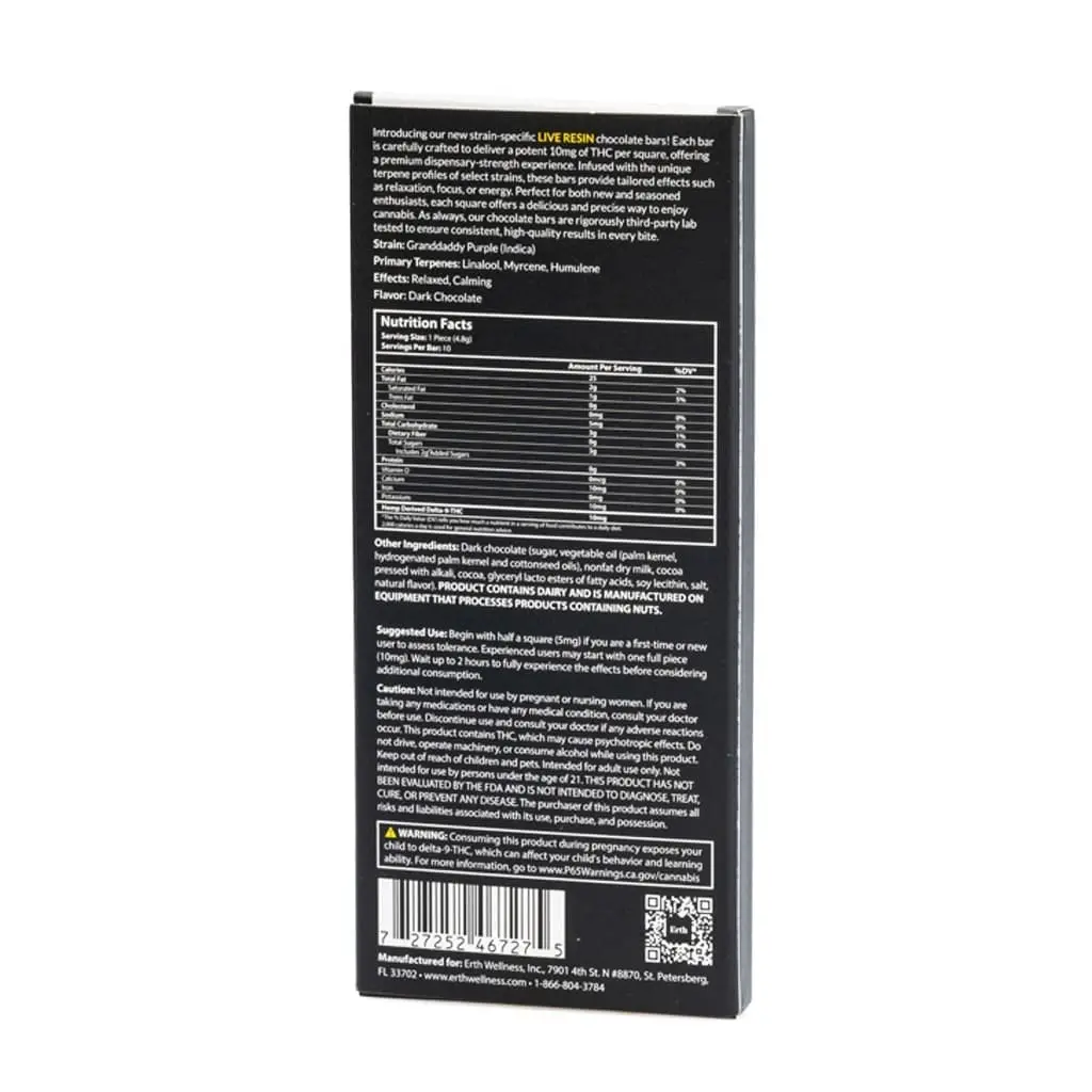 Erth Wellness Delta 9 THC Live Resin Chocolate Bar – Granddaddy Purple Indica COA
