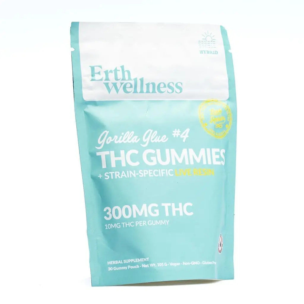 Get the bold, piney bite of Gorilla Glue #4 (GG#4) in a convenient edible form with Erth Wellness THC Live Resin Gummies – GG#4. Each 30-count bag delivers 10 milligrams of hemp-derived Delta 9 THC per gummy, infused with live resin and strain-specific terpenes for a rich, earthy flavor and deeply relaxing effects true to the original strain.