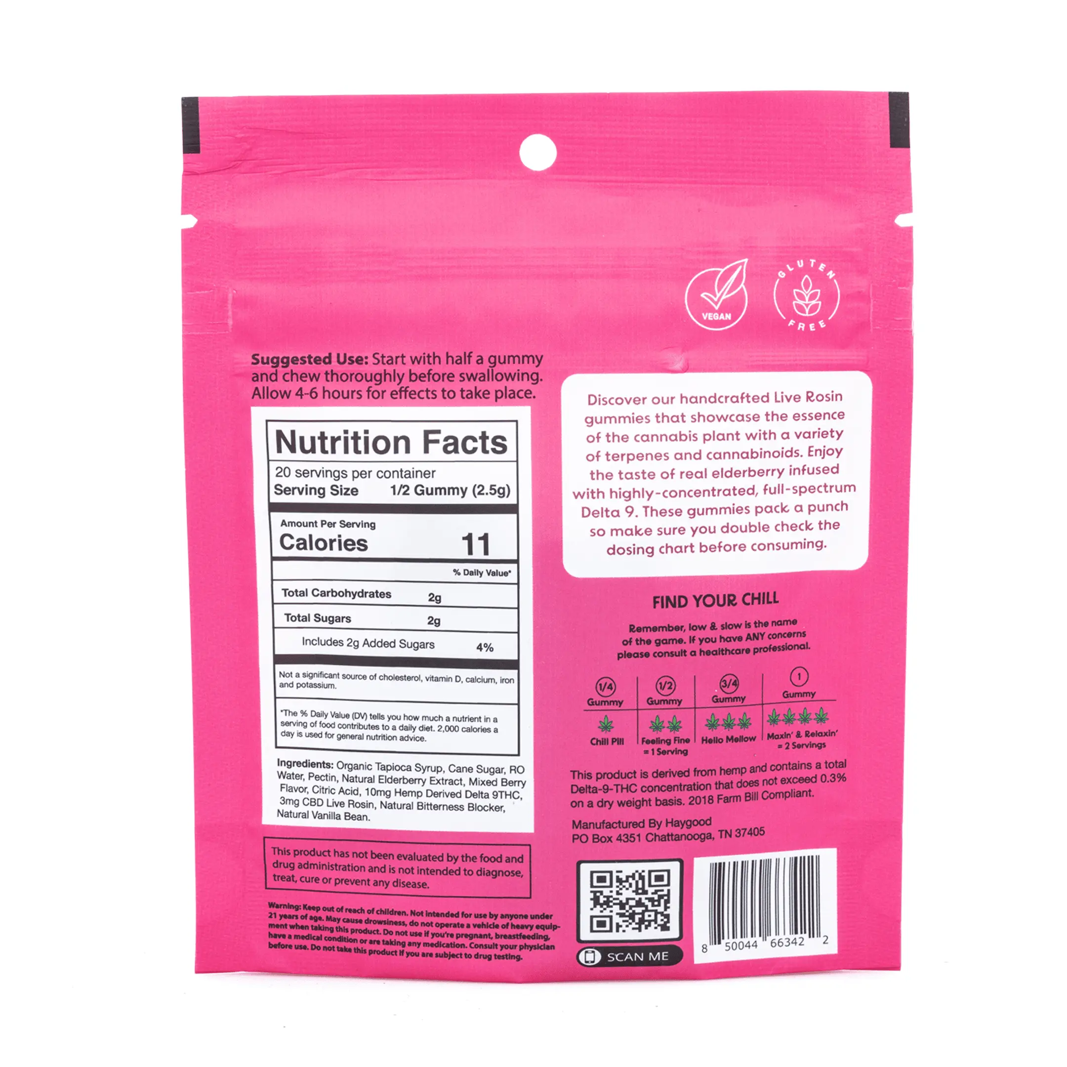 Organic tapioca syrup, cane sugar, RO water, pectin, natural elderberry extract, natural mixed berry flavor, 10 mg hemp derived Delta 9 THC, 3 mg CBD live rosin, natural bitterness blocker, citric acid, natural vanilla bean.