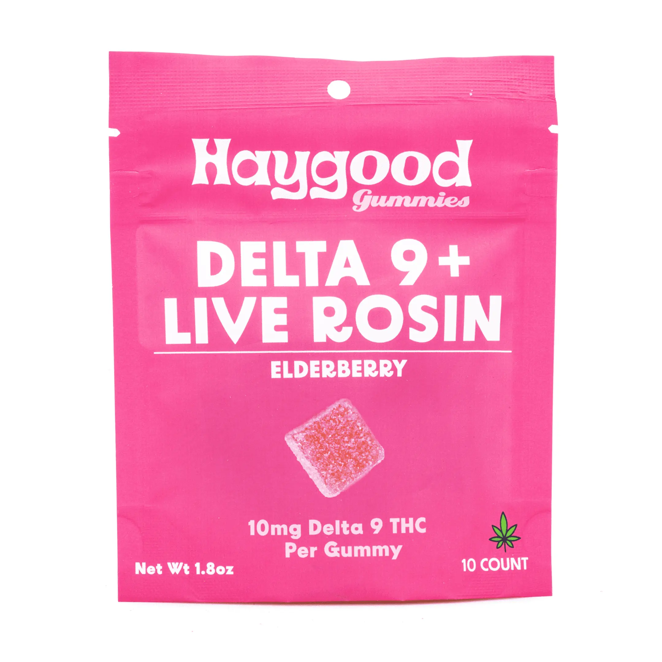 Each 1.8 ounce bag contains 10 gummies that each contain 10 milligrams of Delta 9 and live rosin terpenes. These gummies are made with full-spectrum distillates and live rosin derived from US-grown hemp, so expect an enjoyable fresh cannabis flavor!