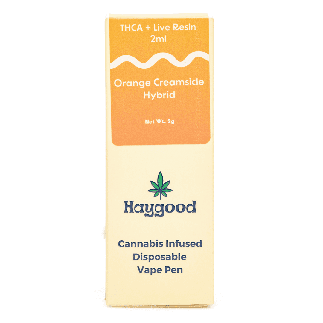 The Haygood THCa and Live Resin Disposable Vape – Orange Creamsicle wraps classic orange-vanilla flavor in a hybrid euphoria that leans smooth, steady, and light. Crafted with live resin from flash-frozen cannabis flower, this 2-gram disposable preserves the strain’s original terpene profile and captures the creamy citrus character and relaxed, feel-good tone that Orange Creamsicle is known for.
