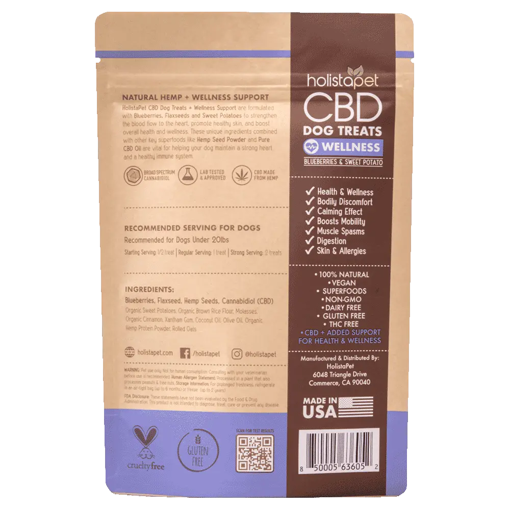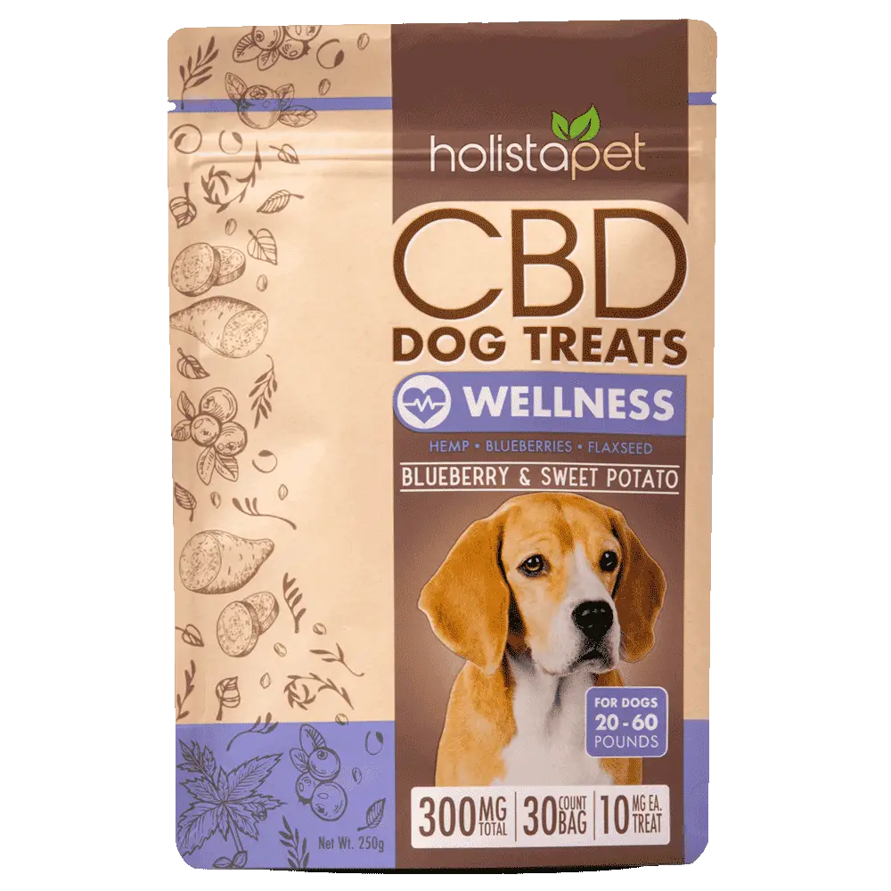 HolistaPet CBD Dog Treats + Heart & Immune Care are formulated to boost immunity, strengthen the cardiovascular system and promote healthy coats and skin. These blueberry and sweet potato flavored treats and are specially formulated with blueberries, flax seeds, & sweet potatoes. These unique ingredients, combined with other key superfoods like Hemp Seed Powder and Broad Spectrum CBD Oil, are vital for preventing infection, sickness, and disease as well as maintaining a strong heart and healthy immune system.