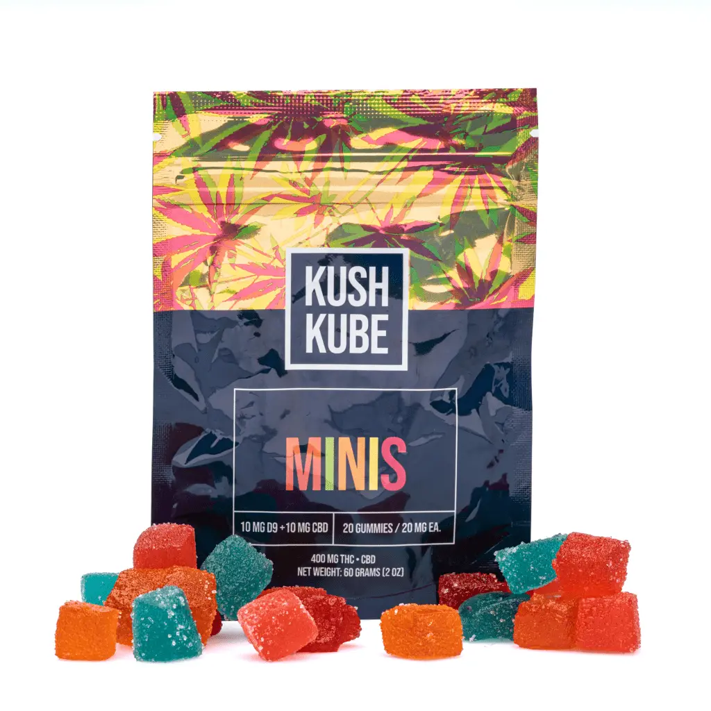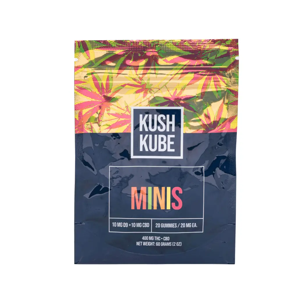 The Kush Kube Delta 9 + CBD Minis are a delightful way to enjoy a 1:1 ratio of Delta 9 THC to CBD in an edible. Delta 9 and CBD work together using the “entourage effect” to potentiate each other which ultimately enhances your experience. These cubes taste great and come in a variety of flavors. There are four flavors in each bag, Blue Raz, Watermelon, Mango, and Mixed Berry. Each potent gummy contains 10 mg of Delta 9 and 10 mg of CBD. Each package contains 20 gummies for a total of 200 mg of Delta 9 THC and 200 mg of CBD. These juicy gummies really pack a punch!