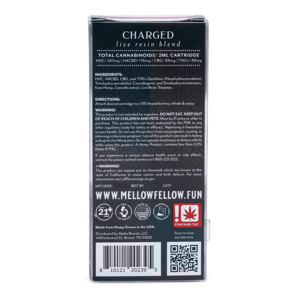 The Mellow Fellow Charged Blend contains a combination of THCV, H4CBD, HHC and CBG. Each 2 gram vape cartridge features a Japanese cotton wick, sub ohm ceramic heating coil, and a borosilicate tank. Can be breath or button activated. Must be used with a 510 compatible battery. Browse our collection of vape batteries.