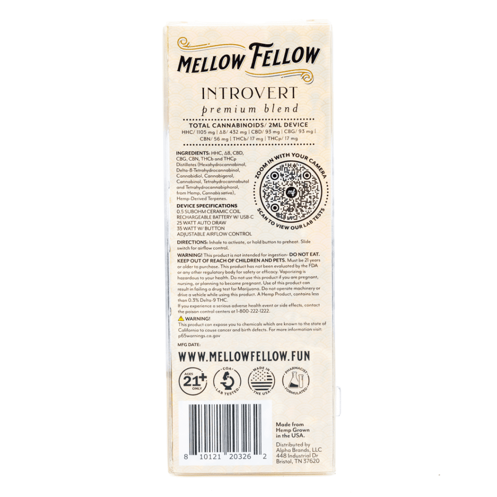 Mellow Fellow captured the fresh and unique flavor of the AK-47 strain and combined it with THCB, THCP, HHC, Delta 8, CBD, CBN, and CBG for a one-of-a-kind mentally intense experience. The entourage effect that Introvert Blend Disposable Vape – AK47 creates is considered by many to be uplifting yet calming.