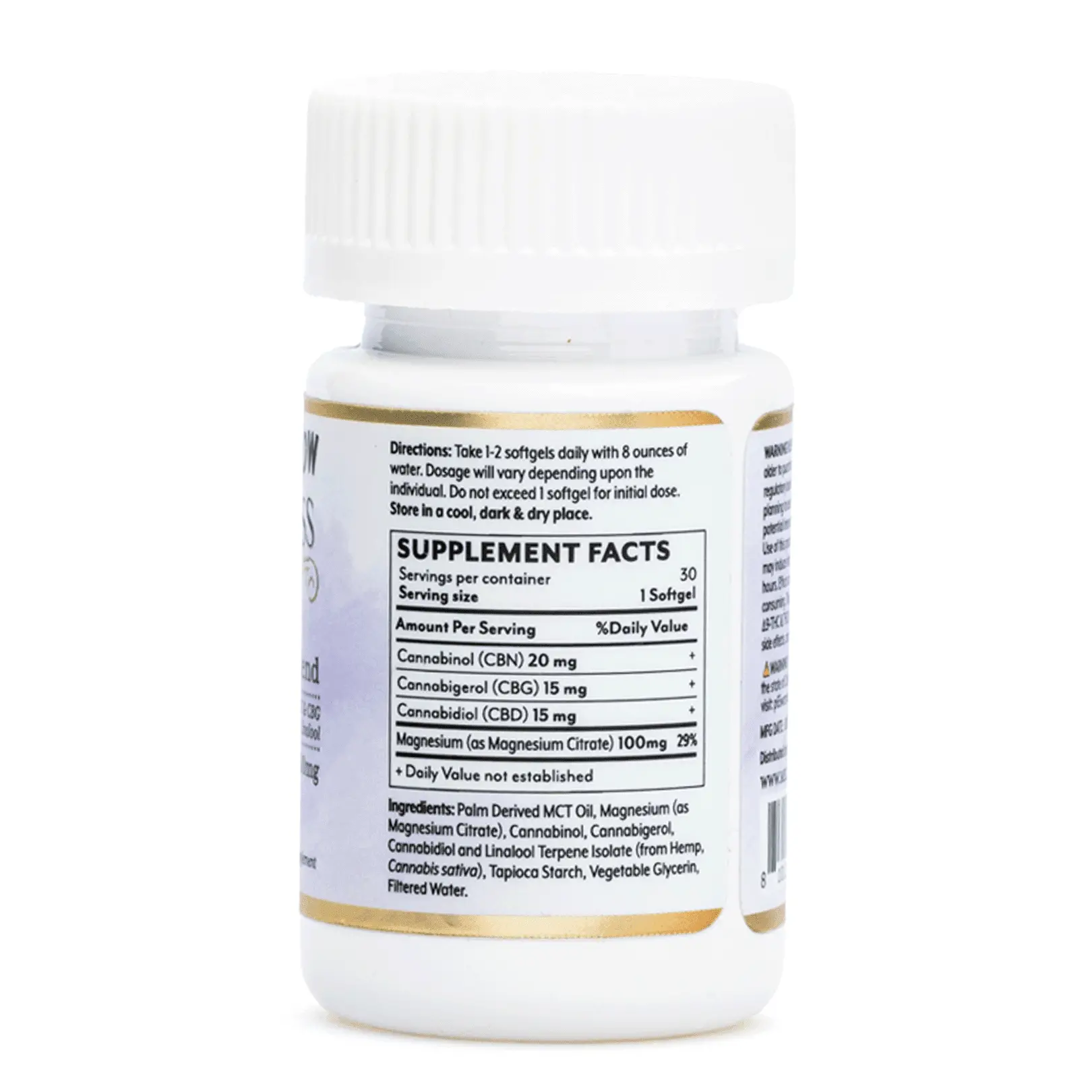 Palm Derived MCT Oil, Magnesium (as Magnesium Citrate), Cannabinol, Cannabigerol, Cannabidiol and Linalool Terpene Isolate (from Hemp, Cannabis sativa), Tapioca Starch, Vegetable Glycerin, Filtered Water.
