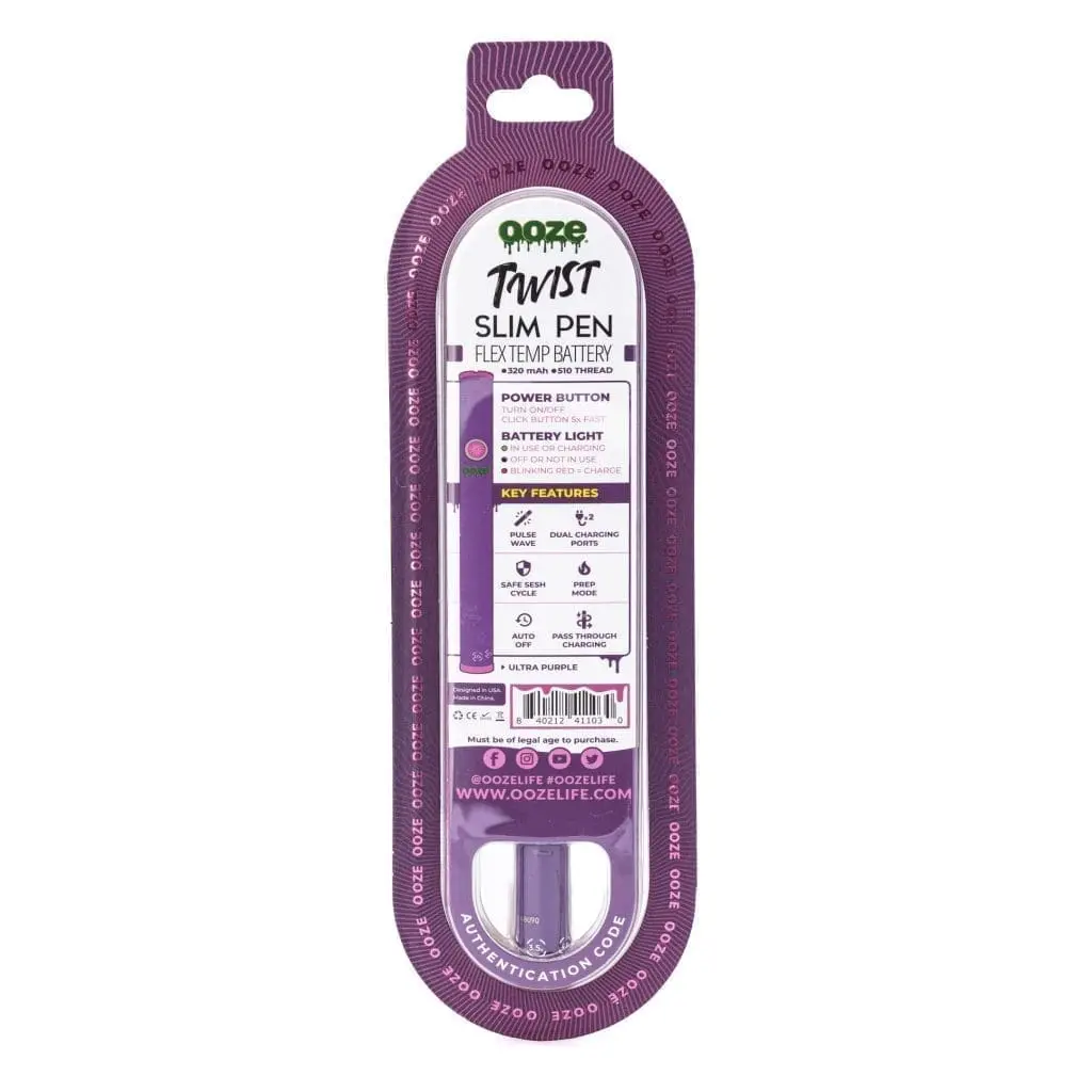 The Ooze Slim Twist Pen 2.0 Vape Battery – Ultra Purple has all the wonderful features of the best selling original Ooze Slim Twist Vape Pen, but has been revamped with new features and a sleeker look. This new vape pen battery has a sturdier feel with more weight in your hand and a more streamlined silhouette. The flex temp dial on the bottom has also been updated. The voltage has been slightly lowered, with a new range from 2.0V to 4.0V, which works better with oil cartridges that are notorious for burnt coils. To adjust the voltage level, you simply twist the dial on the bottom, which has notches that click into place, allowing you to know exactly how hot the device is heating at any given moment.
