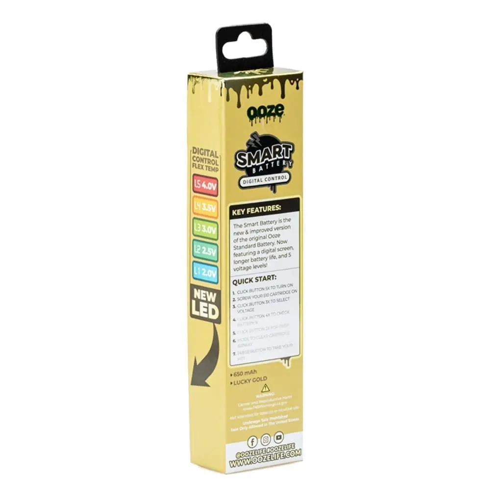 Step up your setup with the Ooze Smart Battery Vape Pen – Lucky Gold. This striking colorway pairs high-gloss gold style with the smart features that make Ooze a trusted favorite. Adjustable voltage settings, a preheat function, and a 650 mAh capacity ensure you get the most out of every session, all in a compact device that slips easily into your pocket.