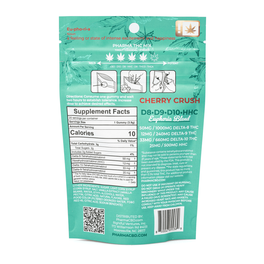 The PharmaTHC Euphoria Blend Gummies – Cherry Crush (1000 mg Delta 8 + 240 mg Delta 9 + 660 mg Delta 10 + 500 mg HHC Total) are some of the most potent legal cannabinoid gummies on the planet. They combine the powers of Delta 8, Delta 9, Delta 10, and HHC to create an euphoric experience that you may never forget. These vegan gummies taste great with a fresh tart cherry flavor. Each gummy contains 50 mg of Delta 8 THC, 12 mg of Delta 9 THC, 33 mg of Delta 10 THC, and 25 mg of HHC, and each bag contains 20 gummies.