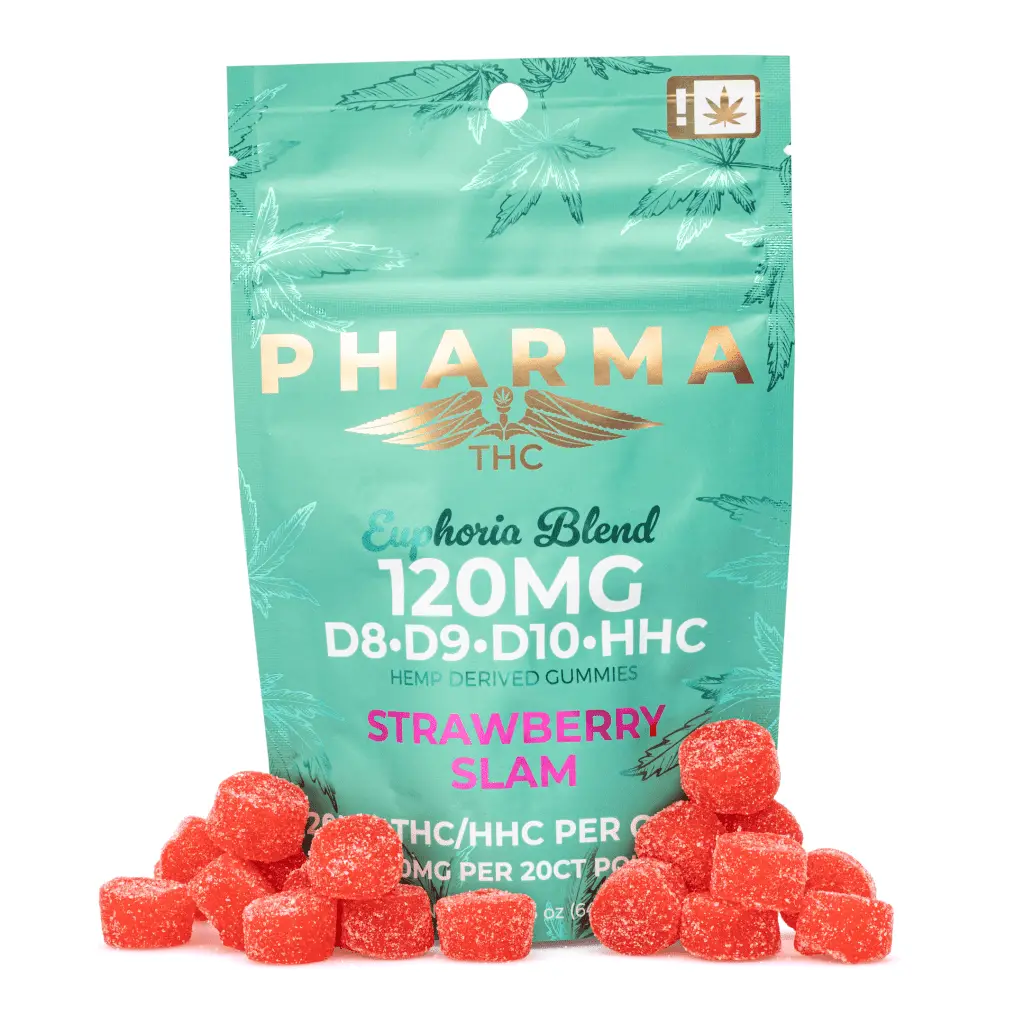 The PharmaTHC Euphoria Blend Gummies – Strawberry Slam (1000 mg Delta 8 + 240 mg Delta 9 + 660 mg Delta 10 + 500 mg HHC Total) are some of the most potent legal cannabinoid gummies on the planet. They combine the powers of Delta 8, Delta 9, Delta 10, and HHC to create an euphoric experience that you may never forget. These vegan gummies taste great with a tantalizing strawberry flavor. Each gummy contains 50 mg of Delta 8 THC, 12 mg of Delta 9 THC, 33 mg of Delta 10 THC, and 25 mg of HHC, and each bag contains 20 gummies.