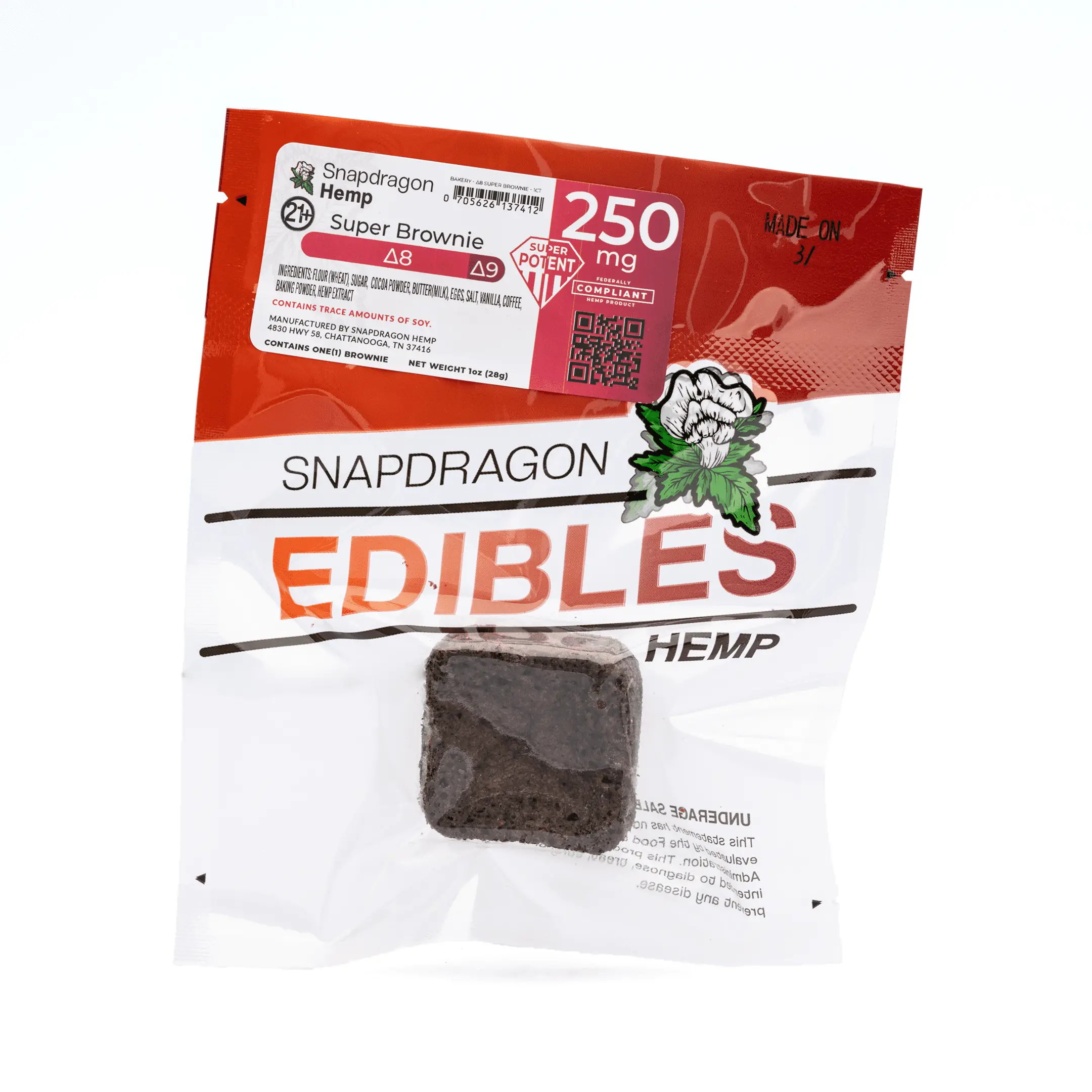 The Snapdragon High Potency Delta 8 THC Brownie contains 212 mg of Delta 8 plus 39 mg Delta 9 THC for that extra kick! This chocolate brownie is baked fresh and then vacuum sealed for the freshest delivery of a highly potent, one-of-a-kind uplifting and motivating feel with a calming body sensation. This tasty brownie is made with flavorless Delta 8 THC distillate derived from US grown hemp, so there’s little to no cannabis flavor!