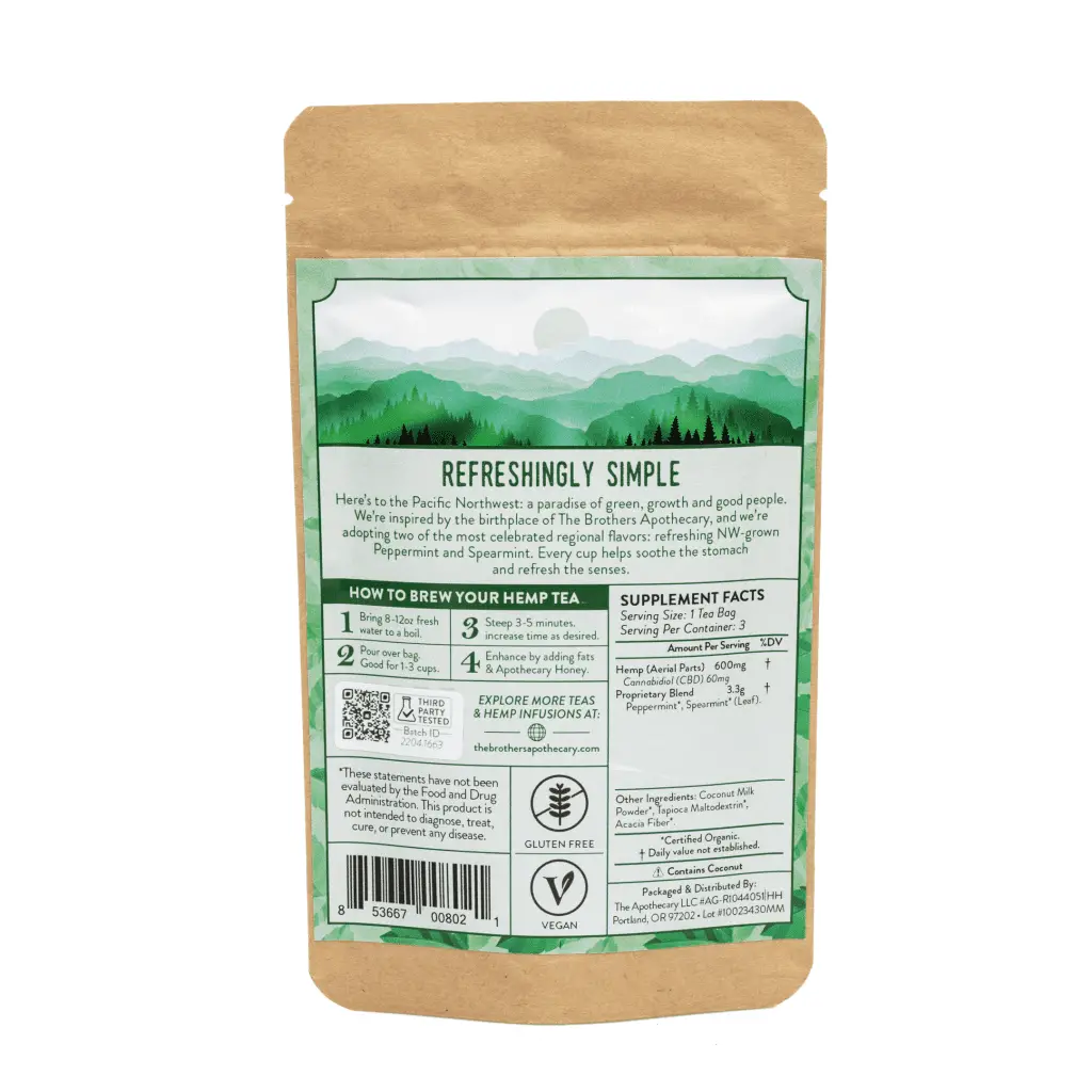 Here’s to the Pacific Northwest: a paradise of green, growth and good people. Inspired by the birthplace of The Brothers Apothecary, they have adopted two of the most celebrated regional flavors: refreshing NW-grown Peppermint and Spearmint.  Each package contains:  3 tea bags, 60 MG Full Spectrum CBD per tea bag, no caffeine,  coconut milk (used as a lipid to increase CBD absorption)
