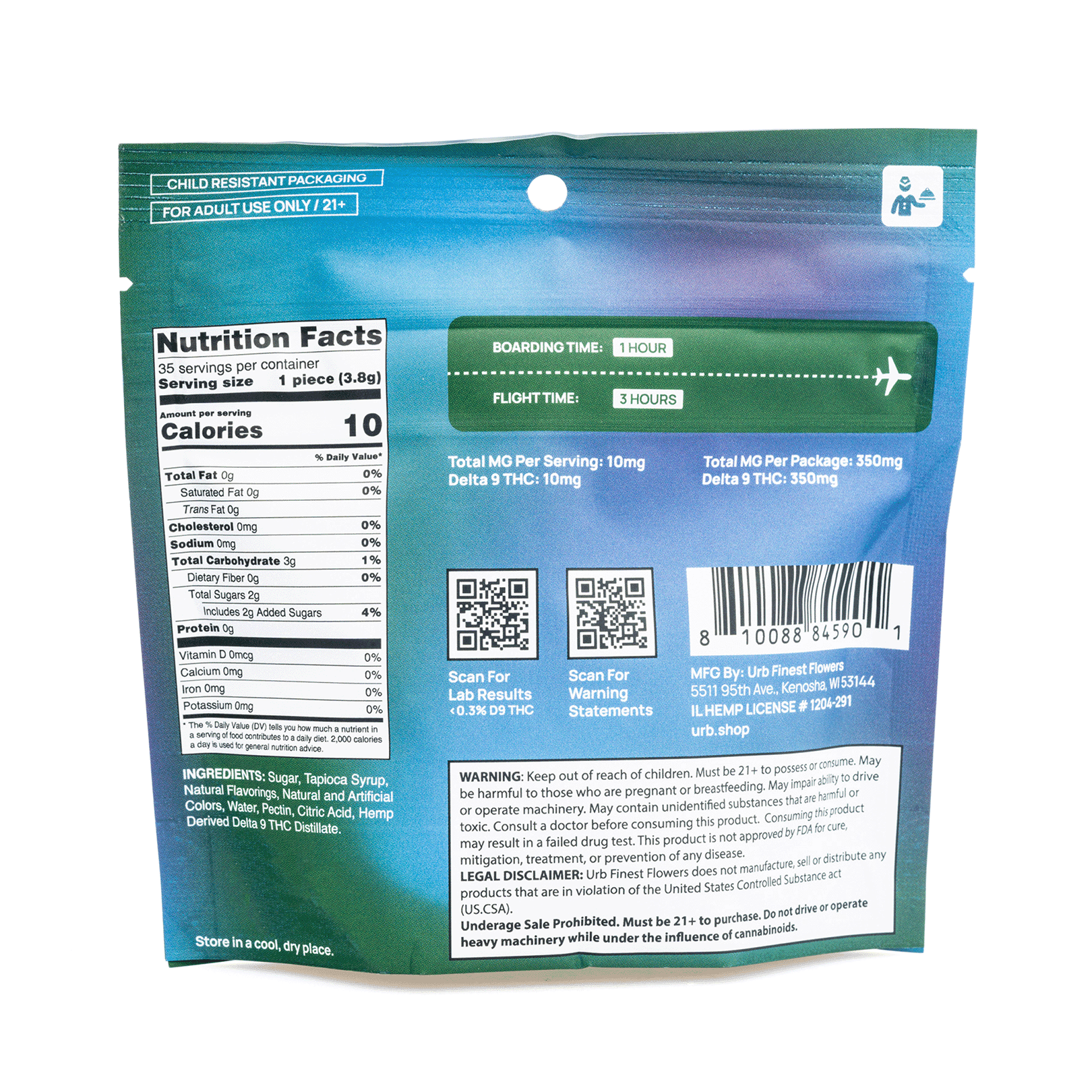 The Urb Delta 9 THC Gummies – Sour Blueberry contain 10 mg of hemp-derived Delta 9 THC per gummy and have a delicious sour blueberry flavor. Each package contains 35 gummies, for a total of 350 mg hemp-derived Delta 9 THC per bag. These yummy gummies deliver a potent, heady feel that can be uplifting and motivating. These edibles are made with flavorless Delta 9 THC distillate derived from US grown hemp, so there’s no cannabis flavor!