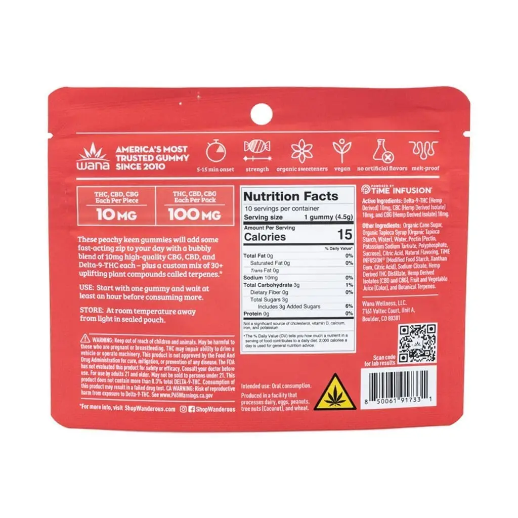 Spark creativity and lift your spirits with Wana Quick Inspire Gummies – Peach Bellini. Infused with 10 milligrams of Delta 9 THC, 10 milligrams of CBD, and 10 milligrams of CBG per gummy (300 milligrams total cannabinoids per package), these melt-proof, vegan gummies bring the crisp sweetness of ripe peaches with a bubbly citrus twist – just like your favorite brunch-time cocktail.
